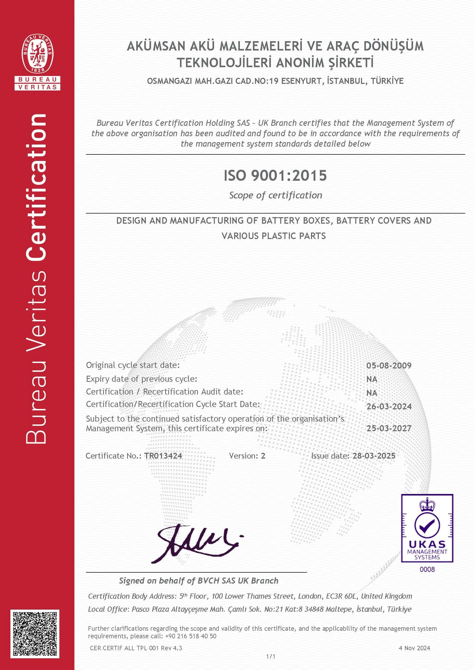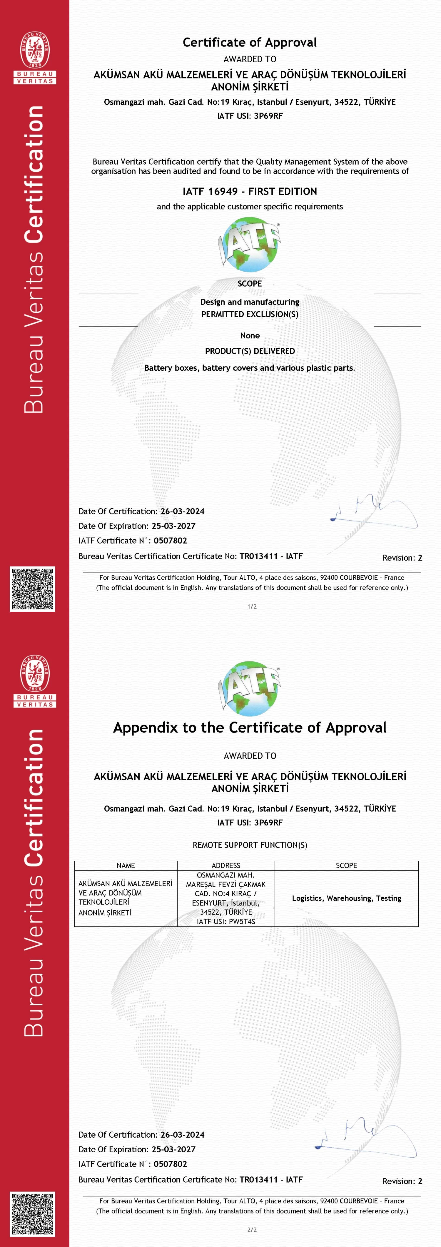 Akümsan’ın tüm yönetim ve üretim süreçleri, 23 yıllık IATF 16949 tecrübesine dayanarak yapılandırılmıştır. Bu standartlara uygun şekilde oluşturulan güçlü tedarikçi ağı sayesinde müşterilerine istikrarlı ve yüksek kaliteli çözümler sunmaktadır.